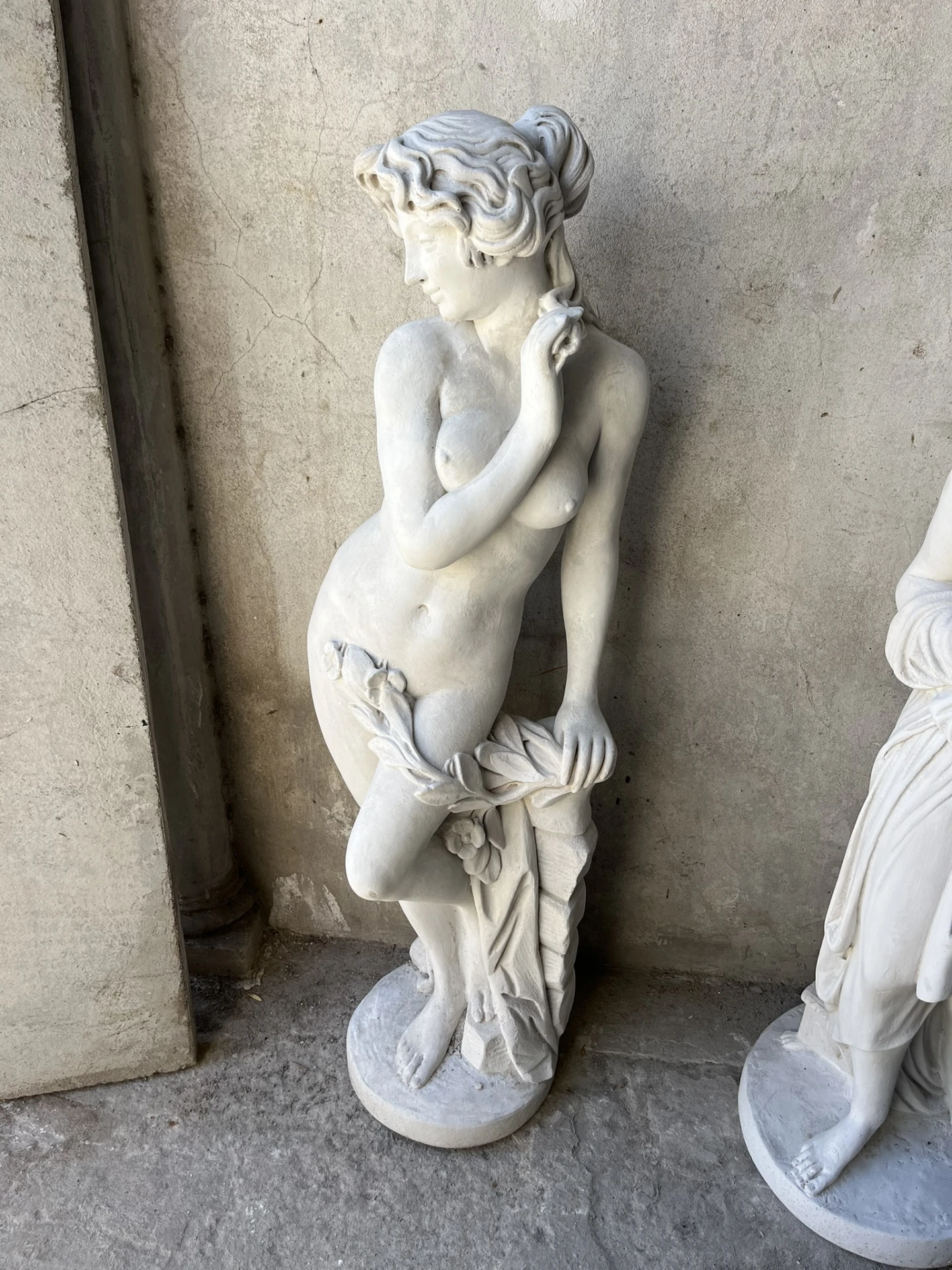 Escultura realizada en mármol reconstituido (marmolina) o en yeso, impermeabilizada, con estructura interna de hierro y de excelente terminación (en color gris/blanco). Opción: terminación en símil piedra Paris (con un 25% de recargo). Ideal para decoraciones.
